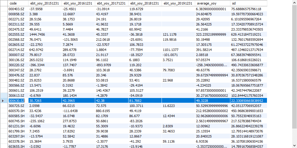 你会发现大部分使用MACD策略收益10%以上的股票,其同比年利润增长都是大于0的,只有2只股票例外。此外,大部分股票平均年利润同比增长都在20%到30%左右,而且不会有太大的波动。