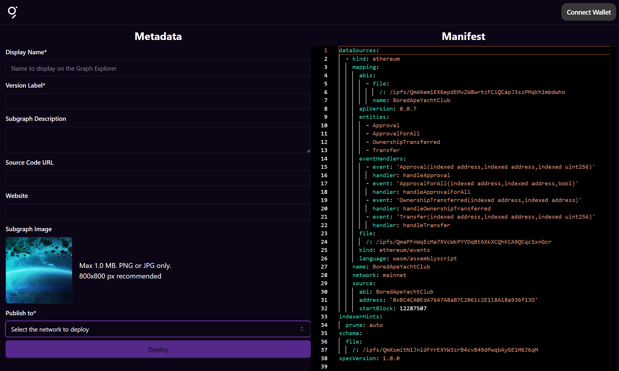 graph codegen && graph buildthengraph publish. - A browser window will prompt you to connect your wallet, add metadata, and publish your Subgraph to the network of your choice.