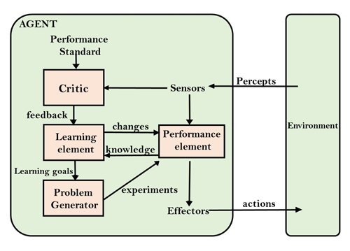 - Learning Element: This part acts as the central cognitive hub of the agent, responsible for analyzing the experiences acquired from interactions with the surroundings. Through the use of different machine learning algorithms like reinforcement learning or supervised learning, the learning component consistently updates the agent's internal model or knowledge base, consequently improving its decision-making abilities.