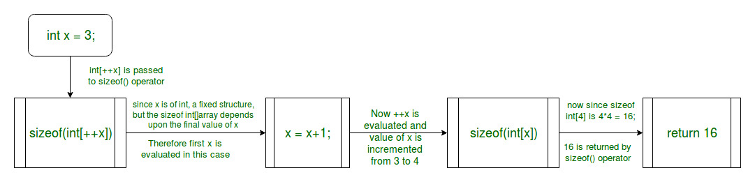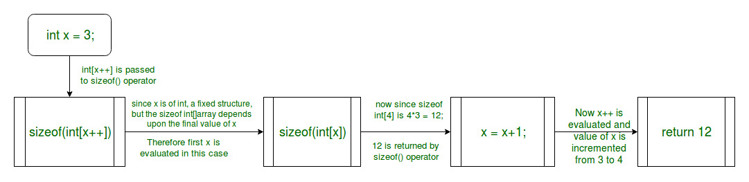 In this example, the sizeof operator needs to evaluate the expression in order to calculate the size of the array which is shown in the figure. Hence, in this case, we get the value of x after incrementation.