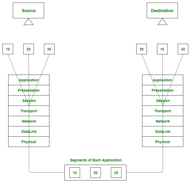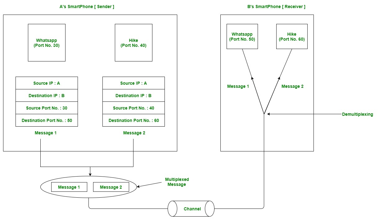 Now the messages from both the apps will be wrapped up along with appropriate headers(viz. source IP address, destination IP address, source port no, destination port number) and sent as a single message to the receiver. This process is called multiplexing. At the destination, the received message is unwrapped and constituent messages (viz messages from a hike and WhatsApp application) are sent to the appropriate application by looking to the destination the port number. This process is called demultiplexing. Similarly, B can also transfer the messages to A.