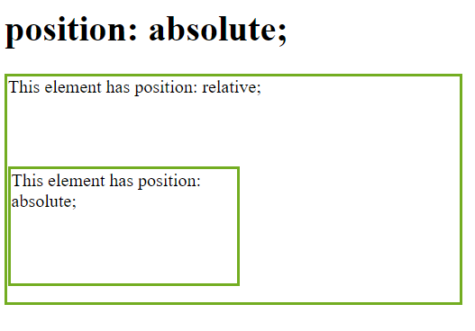 Example: It is an example of position: absolute; property. The absolute element is positioned 80px from the top and right of its closest positioned ancestor (the relative container).