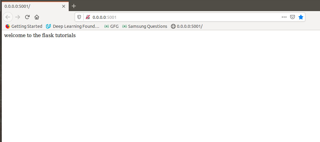 Go inside the root folder "flask-docker-demo" if you aren't already in this directory and run the following command "python demo.py" It should start our development server which comes with the flask on "http://0.0.0.0:5001/". see the screenshot below.