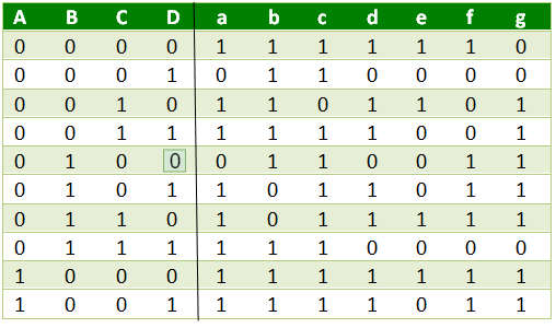 - Output for first combination of inputs (A, B, C and D) in Truth Table corresponds to '0' and last combination corresponds to '9'. Similarly rest corresponds from 2 to 8 from top to bottom.