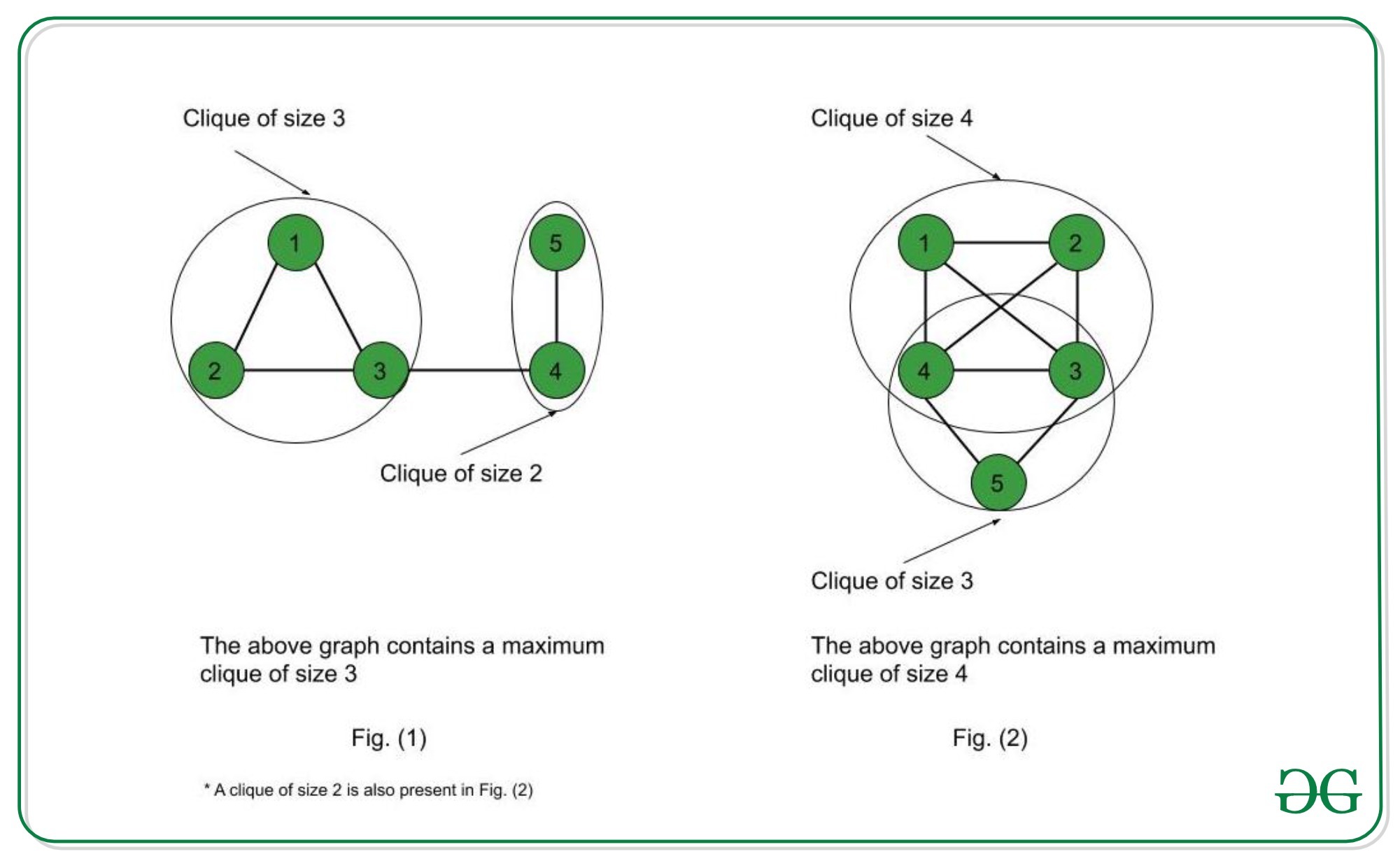A clique is a subgraph of a graph such that all the vertices in this subgraph are connected with each other that is the subgraph is a complete graph. The Maximal Clique Problem is to find the maximum sized clique of a given graph G, that is a complete graph which is a subgraph of G and contains the maximum number of vertices. This is an optimization problem. Correspondingly, the Clique Decision Problem is to find if a clique of size k exists in the given graph or not.