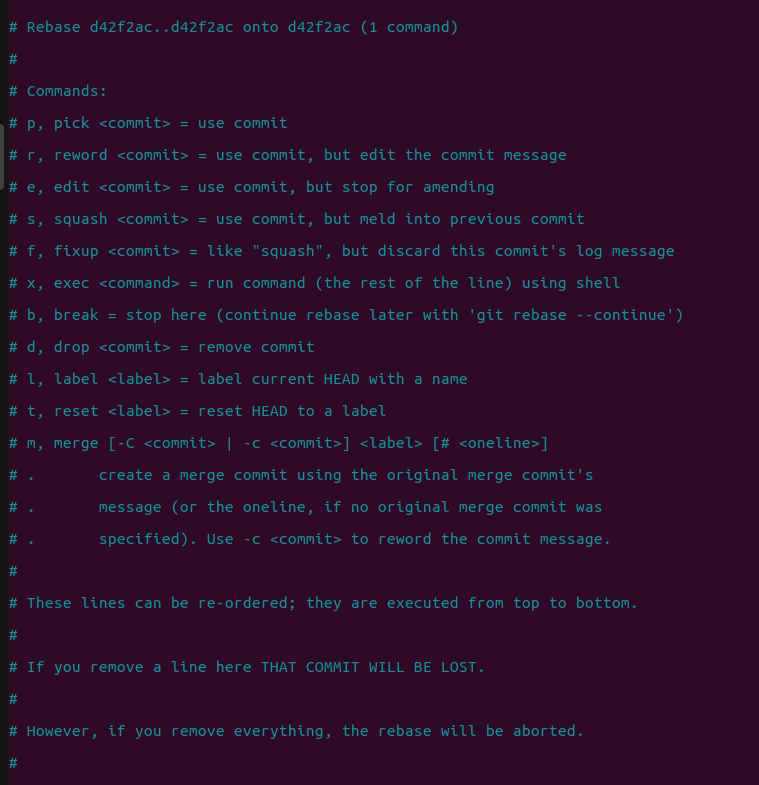 You will see a list of options that you can use to be taken to a view where you can edit the message. However, as can be seen from the above listing, interactive rebases offer a lot more than simple commit message editing: you can completely remove commits by deleting them from the list, as well as edit, reorder, and squash them. Squashing allows you to merge several commits into one before pushing them to the remote.