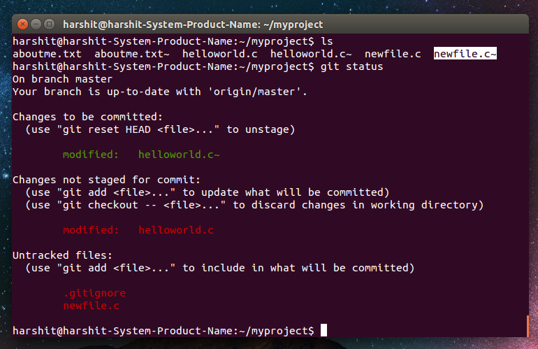 Now, if we want to ignore a specific group of files with similar extensions ( .txt, .cpp, etc) then we can also do it with git. For example, Let us consider we want to ignore the .c~ files that we can see (helloworld.c~). I have made another file named newfile.c so that there is another .c~ file which would be ignored. We need to follow two simple steps: