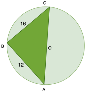 AC^{2}= AB^{2} + BC^{2} \\ = AC^{2} = 12^2 + 16^2 \\ = AC = \sqrt{12^2 + 16^2} \\ = AC = \sqrt{144 + 256}\\ = AC = \sqrt{400} \\ = AC = 20
