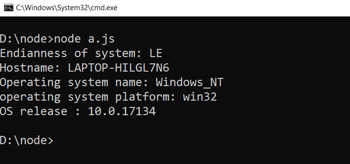 Example 2: This code snippet uses Node.js os module to display the system's endianness, hostname, OS name, platform, and release information.