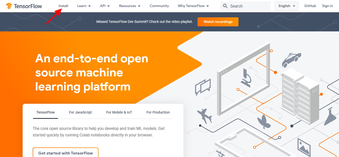 Tensorflow can be downloaded from its official Website tensorflow.org and can be installed with the help of following steps: Step 1: Click on Install on top navigation bar of Tensorflow website.