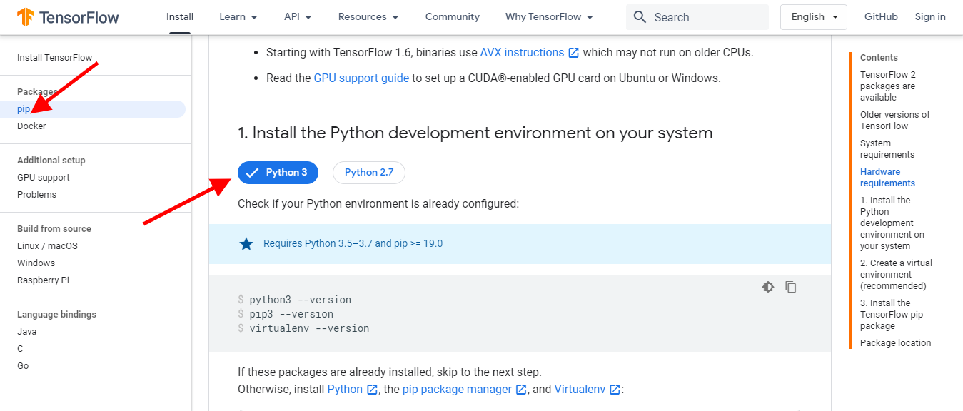 Step 4: To install Tensorflow, we need pip for python. Usually, pip comes already installed if the python version is 3 or above. To know more about pip installation please refer: How to install pip in Windows? For all OS users check the pip section of TensorFlow as shown in the following screenshot: