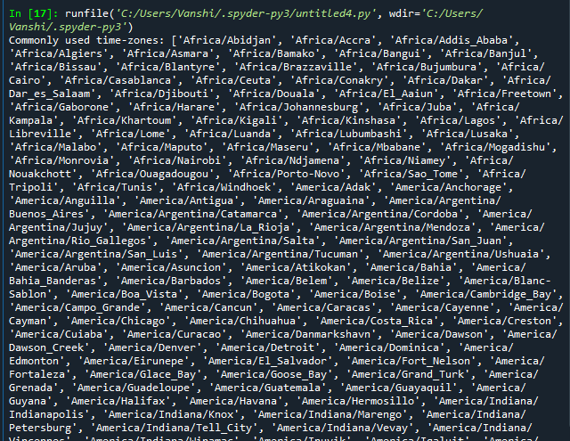 print('the supported timezones by the pytz module:', pytz.all_timezones, '\n')