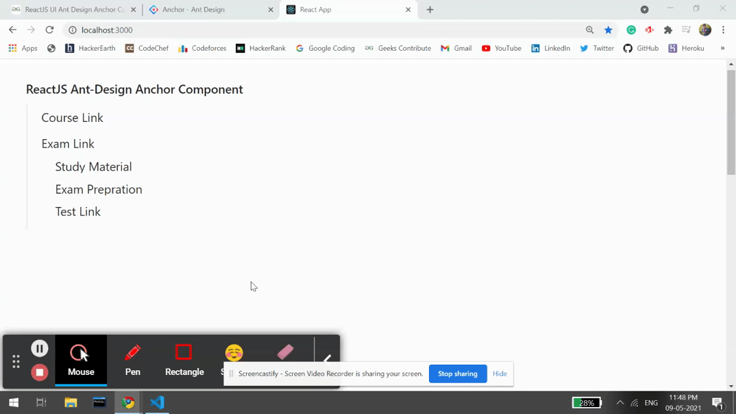 Ant Design Library has this component pre-built, and it is very easy to integrate as well. Anchor Component is used to allow the hyperlinks to scroll on one page. It is useful when we want to display the anchor hyperlinks on the page and allow the user to jumps between them easily. We can use the following approach in ReactJS to use the Ant Design Anchor Component.
