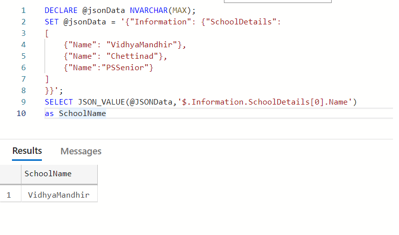 SELECT JSON_VALUE(@JSONData,'$.Information.SchoolDetails[0].Name') as SchoolName