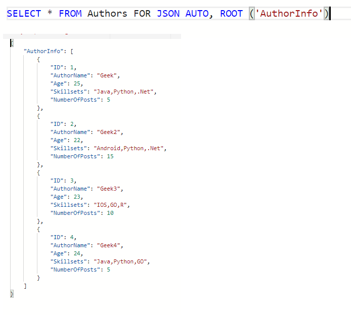 SELECT * FROM Authors FOR JSON AUTO, ROOT ('AuthorInfo')