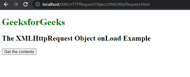 Example 1: In this example, the page is displayed with the 'Get the contents' button. On clicking the button, onload defines a function to be called. It will try to access gfg.html which is present inside the same server and since it is available, it will take the contents and display them in the <div> tagÂ