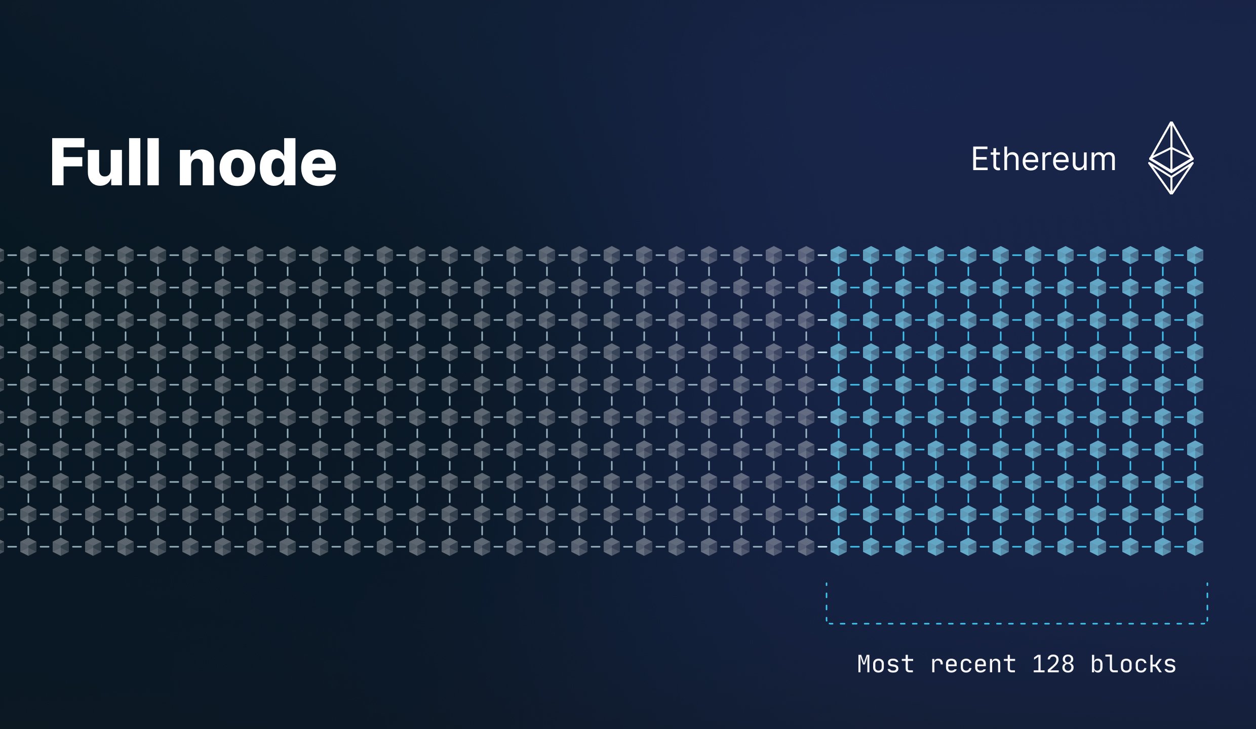 - Full Node: Stores and maintains recent block data (i.e., the last 128 blocks) on disk. It serves blockchain data upon request and helps support the network by participating in block validation and by verifying all blocks and states. All states can be derived from a Full node.