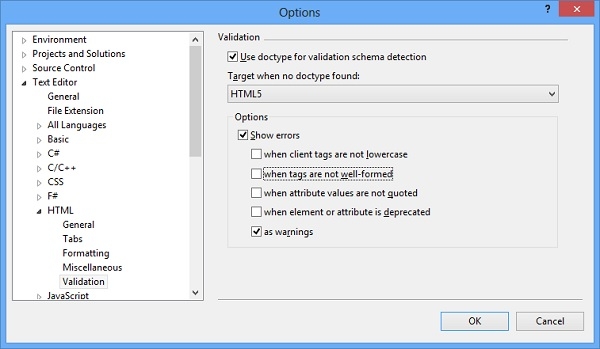 - When Options configuration screen is displayed, go to Text Editor > HTML > Validation.