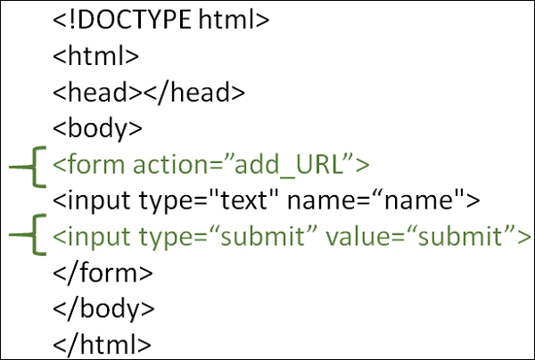 <!DOCTYPE html> <html> <body> <form action="/https/www.tutorialspoint.com/new.php"> Student Name:<br> <input type="text" name="sname"> <br> Student Subject:<br> <input type="text" name="ssubject"> <br> <input type="submit" value="Submit"> </form> </body> </html>
