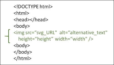 To use SVG images in HTML5, use <img> element or <svg>. To add SVG files, you can use <img> <object>, or <embed> element in HTML. Choose any one of them according to your requirement.