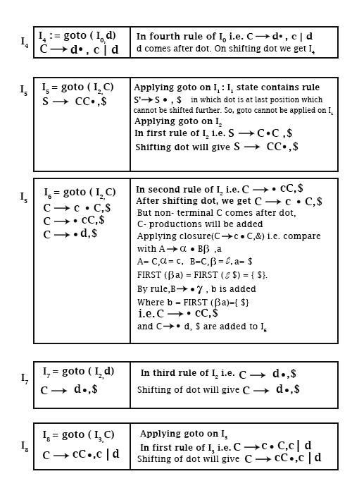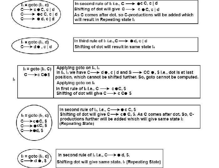 In I7, I8, I9 we have production C → d ?, $, c → cC ?, c | d and ? C → cC ?, $ respectively, i.e., the dot cannot be shifted further.