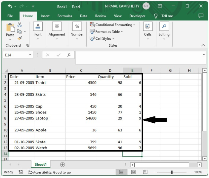 Let us consider an Excel sheet where the data in the sheet is similar to the data in the below image.