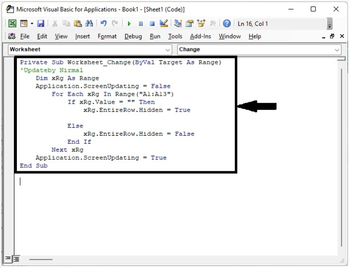 Private Sub Worksheet_Change(ByVal Target As Range) 'Updateby Nirmal Dim xRg As Range Application.ScreenUpdating = False For Each xRg In Range("A1:A13") If xRg.Value = "" Then xRg.EntireRow.Hidden = True Else xRg.EntireRow.Hidden = False End If Next xRg Application.ScreenUpdating = True End Sub