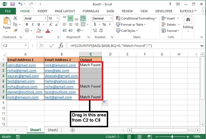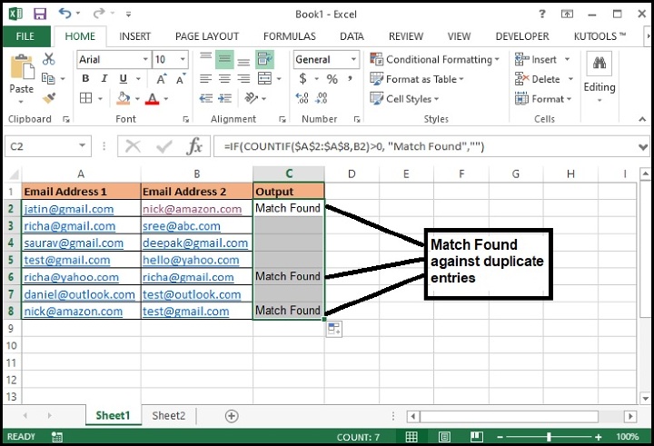 Here, the $A$2:$A$8 is the range of cells in which values of column B will be looked in. If found true, then system will print MATCH FOUND against that email address of column B.