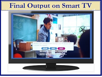 Through screen mirroring, the full contents of the smartphone can be displayed on an external screen wirelessly and without WIFI. You will see an exact real-time replica of your smartphone displayed on the Smart TV when mirroring it.