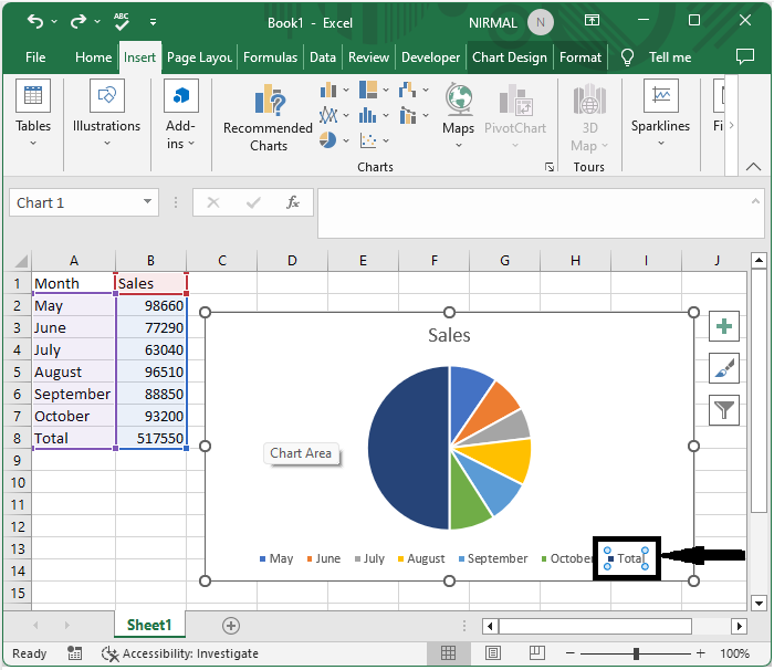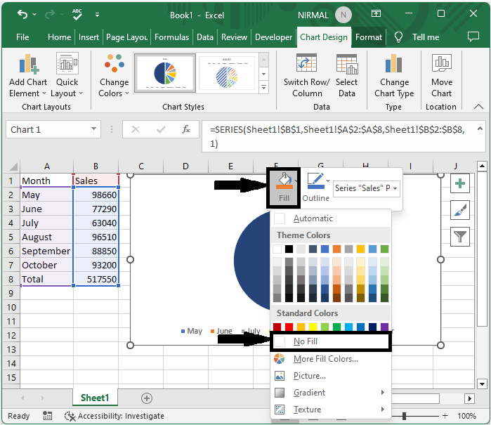 Now right-click on the total part of the chart and click on fill and select no fill.