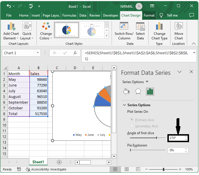 Finally, right-click on the chart and select format data series, changing the angle of the first slice to 270 degrees to complete the task.