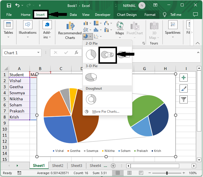 First, select the range of cells, then click on insert and select Pie of Pie chart.