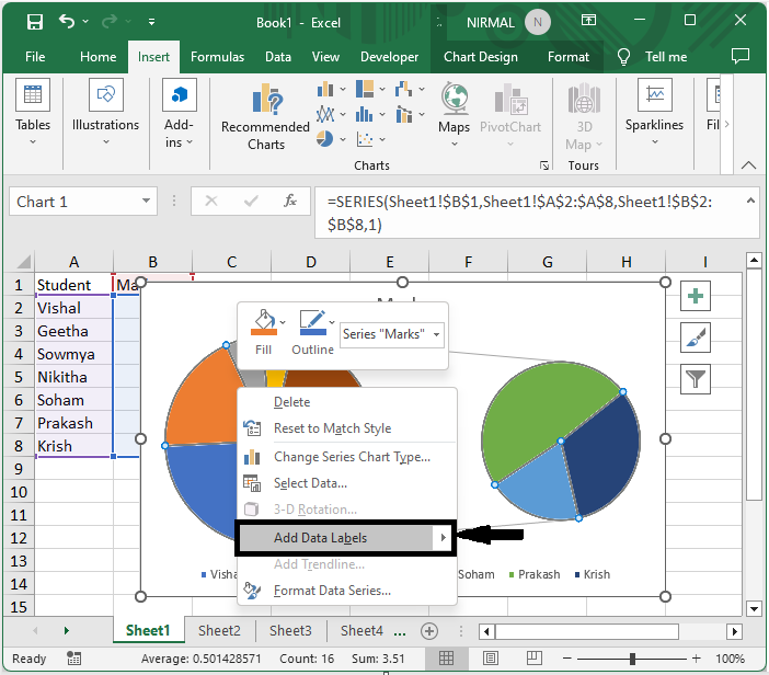 Then you can see that the chart was created successfully. Then, to add the data labels, right?click on the chart and select Add data labels.