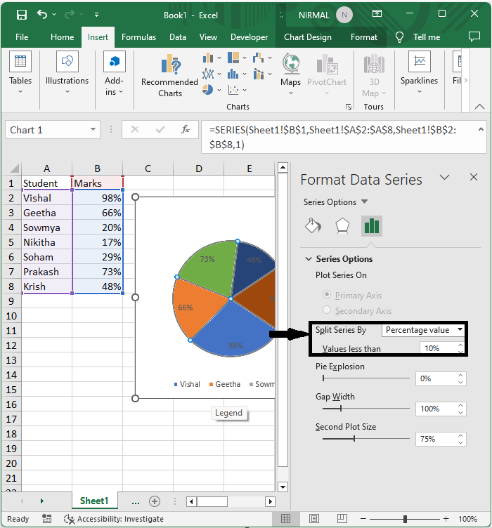 Now again, right?click on the chart and select Format data series. Set "Set split series by" to percentage, "Second plot contains all the values less than" to 10, and close the format window to complete the task.
