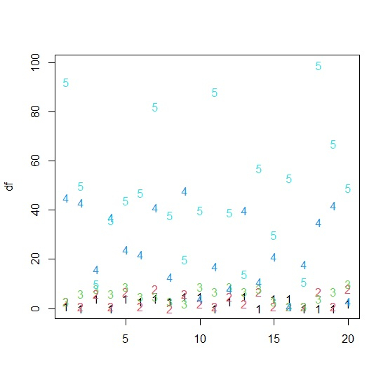 set.seed(555) v1<-sample(0:5,20,replace=TRUE) v2<-sample(0:9,20,replace=TRUE) v3<-sample(1:10,20,replace=TRUE) v4<-sample(1:50,20) v5<-sample(10:100,20) df<-data.frame(v1,v2,v3,v4,v5) df