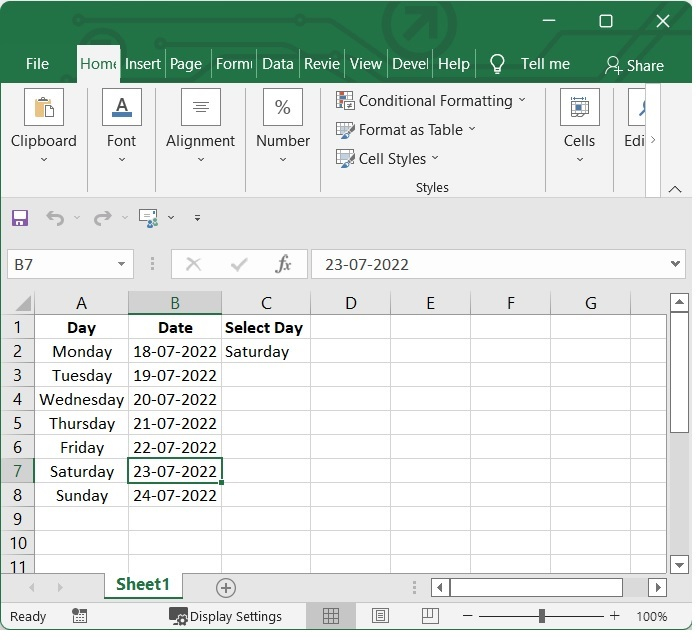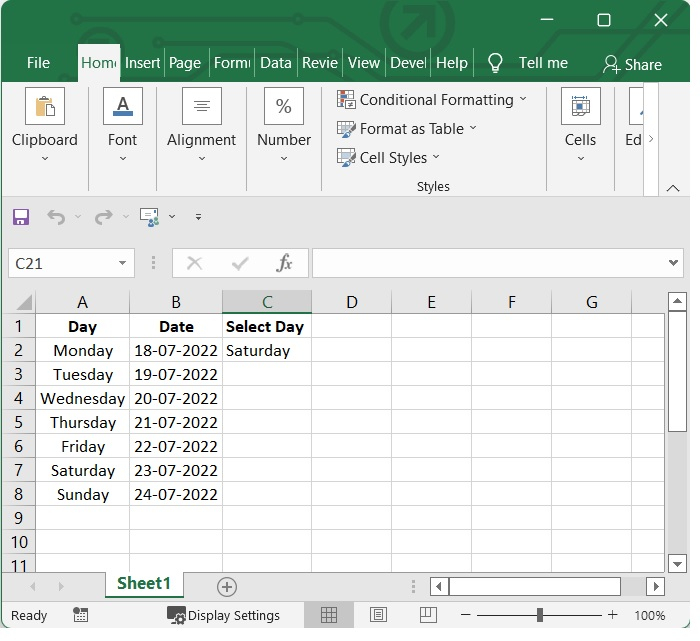 In our example we have the days and dates in an excel sheet with a dropdown list which contains the days from Monday to Sunday. See the below given image.