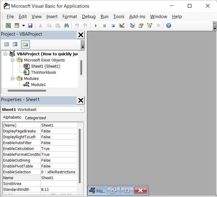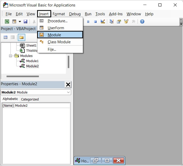 To add the VBA code in it, open the Microsoft Visual Basic for Applications window, by pressing the Alt key and the F11 (Alt+F11) key simultaneously.