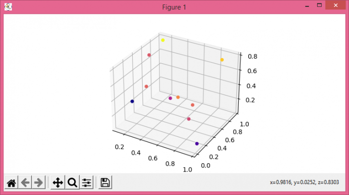 import numpy as np from matplotlib import pyplot as plt plt.rcParams["figure.figsize"] = [7.50, 3.50] plt.rcParams["figure.autolayout"] = True fig = plt.figure() ax = fig.add_subplot(projection='3d') N = 10 x = np.random.rand(N) y = np.random.rand(N) z = np.random.rand(N) ax.scatter(x, y, z, c=y, cmap='plasma', alpha=1, depthshade=False) plt.show()