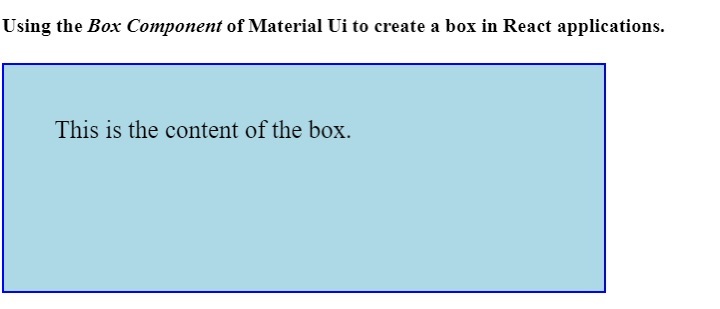import React from "react"; import Box from "@mui/material/Box"; function App() { return ( <div> <h4> Using the <i> Box Component </i> of Material Ui to create a box in React applications. {" "} </h4> <Box sx = {{ width: 400, height: 100, backgroundColor: "lightblue", border: "2px solid blue", padding: 5, fontSize: 20, }} > This is the content of the box. </Box> </div> ); } export default App;