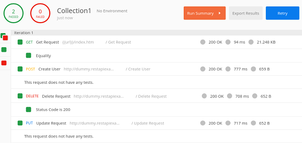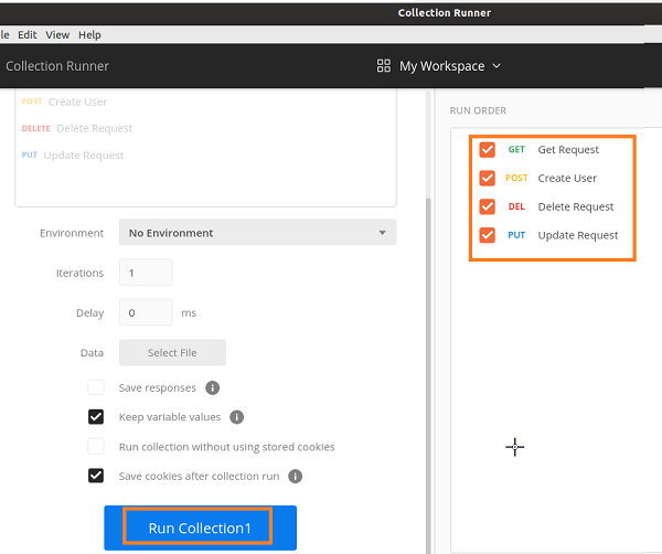 Collection Runner pop-up comes up. The RUN ORDER section shows the order in which the requests shall get executed from top to the bottom. (GET->POST->DEL->PUT). Click on the Run Collection1 button.