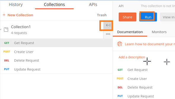 While executing a Collection, the requests are run in the same sequence as they appear in Postman. Let us have a Collection with at least two requests. To trigger them for execution, first click on the arrow appearing to the right of the Collection name in the sidebar. Then click on Run.